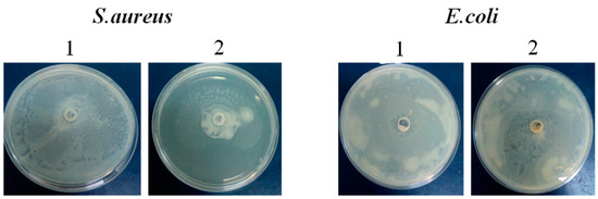The motility of Staphylococcus aureus and Escherichia coli ante (1) and post (2) biopolymer treatment for 18 h.