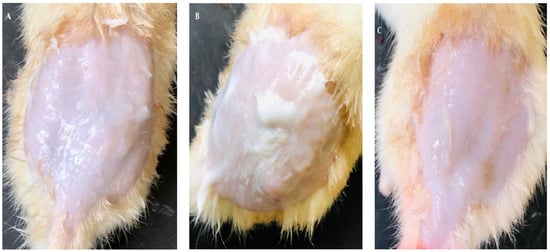 Pharmaceutical products are usually administered topically. A variety of skin reactions such as itchiness or allergic reactions might happen including redness, edema, leaking, scaling, and crusting. When developing a pharmaceutical product, it is important to ensure that all of its ingredients are safe to use on the skin [22]. One experimental in vivo method for determining a pharmaceutical product’s capacity to irritate the skin is the 24 h patch test [23]. It has also been shown that a patch test works better to anticipate skin sensitization reactions than a visual estimation of the inflammatory response [24]. The investigation on skin irritation was executed on healthy albino rats.
