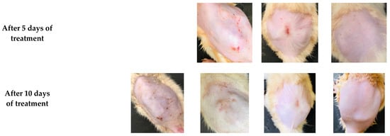 All animals displayed a normal skin structure prior to the induction of a cutaneous fungal infection, devoid of any clinical signs of fungal infection, such as swelling, edema, color changes, or cracking, as illustrated in Figure 2. The animals displayed red patchy areas, inflammation, scaling, edema, and skin cracking after the induction of the fungus. The infected rats were examined daily for indications of infection. The day after the subsequent instillation of the Candida albicans suspension in all of the animals, the first symptoms of infection in the form of skin redness were noticed. On the third day, it was more pronounced as scaling and obviously distinct skin redness.