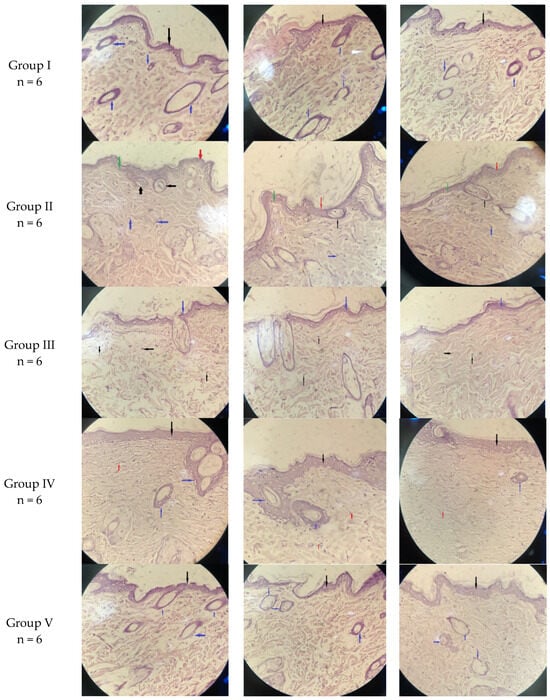 Rats were sedated before being sacrificed at the end of the studies. Ketamine was utilized as an anesthetic. A 1:10 mixture of ketamine 0.2 mL/100 mg and xylazine 50 mg/kg is used. Skin from the affected area was taken out, and secured with 10% formalin, and then clogged with paraffin. Slides made from paraffin blocks with the use of a rotary microtome (Bright Instruments 5040 Microtome, Hntingdon, Cambridgeshire, UK), were divided into 5 µm-thick cuts [44] and stained with hematoxylin–eosin dyes [45,46]. The assessment of the various animal groups was carried out, and the outcomes were compared to control groups. Using a compound microscope (Leica Microsystems, Wetzlar, Germany), the skin samples were examined to identify the epidermal and dermal modifications as well as the signs of inflammation [47].