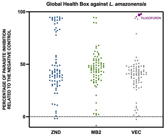 Activity against Leishmania amazonensis of the 240 compounds included in the Global Health Priority Box. The results were expressed as percentages of inhibition relative to the negative control. The flucofuron is indicated with an arrow in purple. Each point represents a compound included in the global health priority box, divided into three groups, including MB2, ZND, and VEC. MB2: 80 compounds with confirmed activity against drug-resistant malaria; ZND: 80 compounds donated by Bristol–Myers Squibb for screening against neglected and zoonotic diseases and diseases at risk of drug resistance; VEC: 80 compounds with activity against various vector species, selected with experts from the IVCC (Liverpool School of Tropical Medicine, Liverpool).