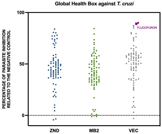 Activity against Trypanosoma cruzi of the 240 compounds included in the Global Health Priority Box. The results were expressed as percentages of inhibition relative to the negative control. The flucofuron is indicated with an arrow in purple. Each point represents a compound included in the global health priority box, divided into three groups, including MB2, ZND, and VEC. MB2: 80 compounds with confirmed activity against drug-resistant malaria; ZND: 80 compounds donated by Bristol–Myers Squibb for screening against neglected and zoonotic diseases and diseases at risk of drug resistance; VEC: 80 compounds with activity against various vector species, selected with experts from the IVCC (Liverpool School of Tropical Medicine, Liverpool).
