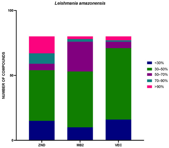 Distribution by plate of the percentage of inhibition against Leishmania amazonensis. The results were expressed as percentages relative to the negative control. MB2: 80 compounds with confirmed activity against drug-resistant malaria (MB2 = 80; <30% = 10; 30–50% = 43; 50–70% = 23; 70–90% = 2; >90% = 2); ZND: 80 compounds donated by Bristol–Myers Squibb for screening against neglected and zoonotic diseases and diseases at risk of drug resistance (ZND = 80; <30% = 15; 30–50% = 39; 50–70% = 5; 70–90% = 8; >90% = 13); VEC: 80 compounds with activity against various vector species, selected with experts from the IVCC (Liverpool School of Tropical Medicine, Liverpool) (VEC = 80; <30% = 16; 30–50% = 55; 50–70% = 5; 70–90% = 1; >90% = 3).