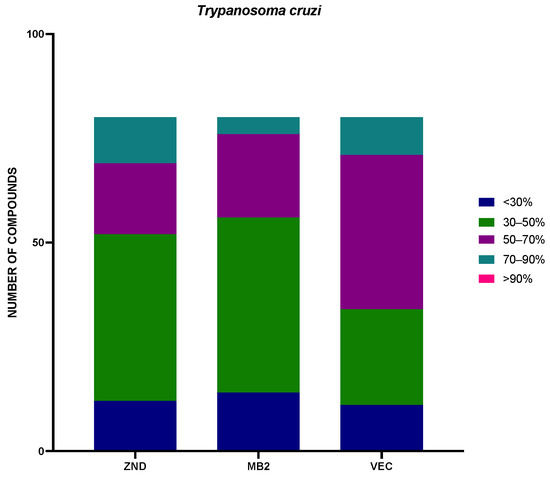 Seeing the results divided by previous use against L. amazonensis, ZND and MB2 plates had a similar quantity of compounds, with inhibition of more than 50% (26 and 27 compounds, respectively). The VEC plate adds up to only nine compounds in this group. In the case of T. cruzi, the opposite was true, with plates ZND and MB2 containing fewer compounds with inhibition greater than 50% (28 and 24 respectively), while plate VEC contained 46 compounds with inhibition greater than 50%.