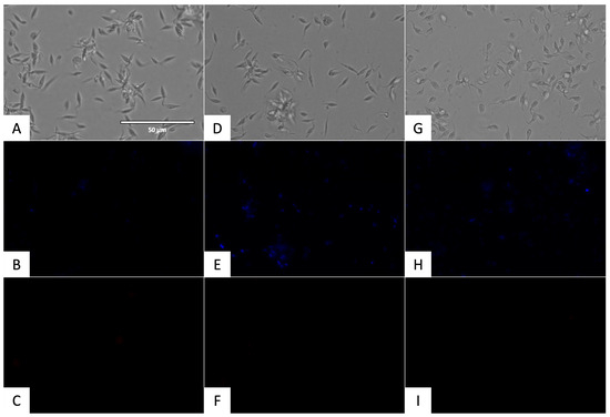 Detection of chromatin condensation using Hoechst/PI. Results after 24 h of incubation with the IC90 against epmastigotes of T. cruzi. Images were captured using an EVOS FL Cell Imaging System (40×). (A) Parasites without treatment in visible channel; (B) parasites without treatment in DAPI channel; (C) parasites without treatment in RFP channel; (D) parasites treated with flucofuron in visible channel; (E) parasites treated with flucofuron in DAPI channel; (F) parasites treated with flucofuron in RFP channel; (G) parasites treated with benznidazole in visible channel; (H) parasites treated with benznidazole in DAPI channel; and (I) parasites treated with benznidazole in RFP channel. Scale bar: 50 μm.