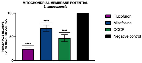 Results of mitochondrial membrane potential alterations expressed as percentages relative to negative control. Miltefosine was added as the standard treatment, and carbonyl cyanide m-chlorophenyl hydrazone (CCCP) was used as positive control. A Tukey test with GraphPad.PRISM® 9.0.0 software was used to test the statistical differences between means. (**** p < 0.0001).