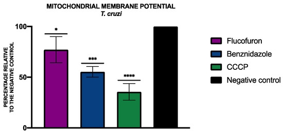 Results of mitochondrial membrane potential alterations expressed as percentages relative to negative control. Benznidazole was added as the standard treatment, and carbonyl cyanide m-chlorophenyl hydrazone (CCCP) was used as positive control. A Tukey test with GraphPad.PRISM® 9.0.0 software was used to test the statistical differences between means. (* p < 0.05; *** p < 0.001; **** p < 0.0001).