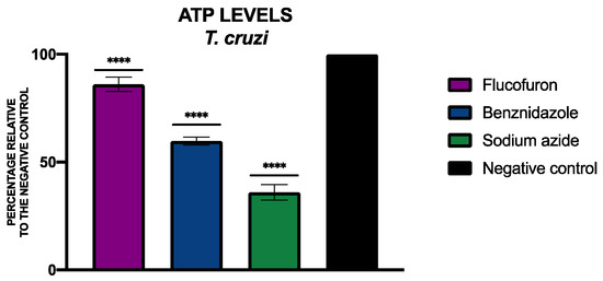 To determine the levels of ATP, the CellTiter-Glo® Luminescent Cell Viability Assay kit (Promega, Madison, WI, USA) was used. Figure 11 and Figure 12 include the percentage of ATP relative to the negative control of L. amazonensis and T. cruzi, respectively, treated with flucofuron.