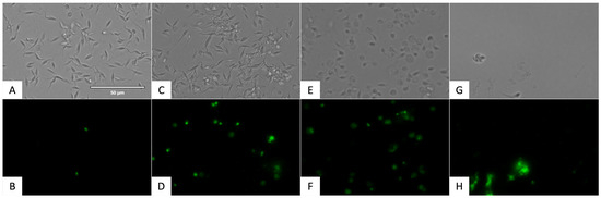 Detection of plasmatic membrane permeability in epimastigote stage of T. cruzi using SYTOX® Green staining (ThermoFisher Scientific, Waltham, MA, USA). Images were captured using an EVOS FL Cell Imaging System (40×). Scale bar: 50 µm. (A) Untreated parasites in visible channel; (B) untreated parasites in GFP channel; (C) parasites treated with flucofuron in visible channel; (D) parasites treated with flucofuron in GFP channel; (E) parasites treated with benznidazole, standard treatment, in visible channel; (F) parasites treated with benznidazole, standard treatment, in GFP channel; (G) parasites treated with Triton 0.1%, positive control, in visible channel; and (H) parasites treated with Triton 0.1%, positive control, in GFP channel.