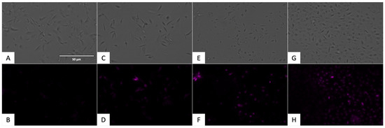 Detection of plasmatic membrane permeability in promastigote stage of L. amazonensis using SYTOX® Green staining (ThermoFisher Scientific, Waltham, MA, USA). Images were captured using an EVOS FL Cell Imaging System (40×). Scale bar: 50 µm. (A) Untreated parasites in visible channel; (B) untreated parasites in GFP channel; (C) parasites treated with flucofuron in visible channel; (D) parasites treated with flucofuron in GFP channel; (E) parasites treated with miltefosine, standard treatment, in visible channel; (F) parasites treated with miltefosine, standard treatment, in GFP channel; (G) parasites treated with Triton 0.1%, positive control, in visible channel; and (H) parasites treated with Triton 0.1%, positive control, in GFP channel.