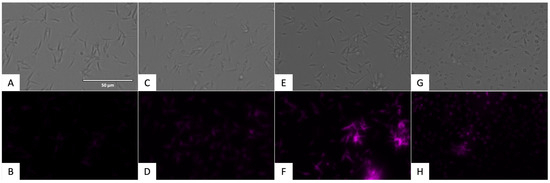 Detection of reactive oxygen species in promastigote stage of L. amazonensis using CellROX® Deep Red staining (ThermoFisher Scientific, Waltham, MA, USA). Images were captured using an EVOS FL Cell Imaging System (40×). Scale bar: 50 µm. (A) Untreated parasites in visible channel; (B) untreated parasites in Cy5 channel; (C) parasites treated with miltefosine, standard treatment, in visible channel; (D) parasites treated with miltefosine, standard treatment, in Cy5 channel; (E) parasites treated with flucofuron in visible channel; (F) parasites treated with flucofuron in Cy5 channel; (G) parasites treated with H2O2 600 mM, positive control, in visible channel; and (H) parasites treated with H2O2 600 mM, positive control, in Cy5 channel.