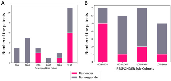 (A). Distribution of the cohorts of responders and non-responders, as determined by the daily dose of selexipag. Dose units are in μg/day. (B). Responder distribution, as determined by the pre-dose of selexipag and final dose of beraprost is depicted. Sub-cohort of higher-dose of beraprost was defined as participants receiving ≥240 μg/day pre-switch, and the sub-cohort of higher-dose selexipag was defined as participants continuing to tolerate ≥2000 μg/day.