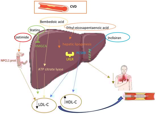 Diabetic patients categorized as very high, high, and moderate risk should attempt to achieve LDL-C levels below 55, 70, and 100 mg/dL, respectively (Class I) []. Ιn the first two groups, a >50% decrease in LDL-C levels is an alternative target. Therefore, diabetic patients with a history of CAD belong to the very-high-CV-risk group and should be treated aggressively []. According to current ESC guidelines, statins are the fundamental pillar of this very-high-risk group and a rapid dosage with up-titration is suggested []. If the desired LDL-C level cannot be attained through statin monotherapy, combination treatment with ezetimibe is advisable. In the case of persistently high LDL-C levels despite a maximum-tolerated statin dosage in combination with ezetimibe, or intolerance to statins, the use of a PCSK9 inhibitor is strongly recommended [] while the implementation of other lipid-lowering therapies is under investigation. Figure 1 depicts the most well-known lipid-lowering medications and their mechanisms.