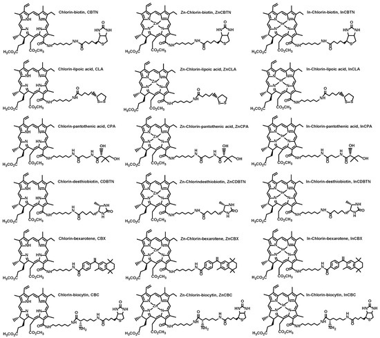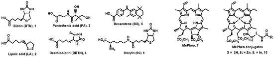 The molecular structures of the vitamins and analogues, namely, biotin (Vit H or B7) 1, lipoic acid (coenzyme) 2, pantothenic acid (Vit B5) 3, desthiobiotin (biotin analogue) 4, bexarotene (Vit A analogue) 5, and biocytin (biotin metabolite) 6 are shown in Figure 1. The chlorin–vitamin conjugates were prepared by linking a chlorin (chlorophyll derivative) methyl pheophorbide a (MePheo) 7 and a vitamin (or vitamin analogue) to create MePheo-conjugates 8 and their Zn and In complexes 9–10 [22,23]. These series of compounds were covered by two patents and the chemical syntheses are published elsewhere [26,27]. The molecular structures of these compounds and the corresponding abbreviations are listed in Figure 2.