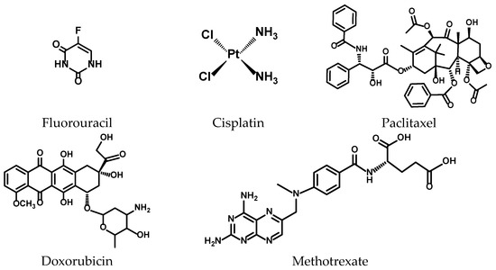 The molecular structures of the chemotherapeutic agents are shown in Figure 3. Paclitaxel, doxorubicin, cisplatin, 5-fluorouracil, and methotrexate were purchased from Fisher Scientific. Safety Data Sheets (SDS) and toxicological information for the five chemotherapeutic compounds used are provided in the Supporting Information (Table S1).