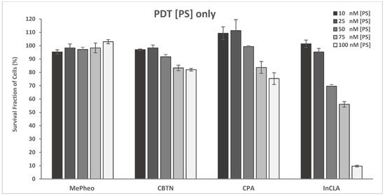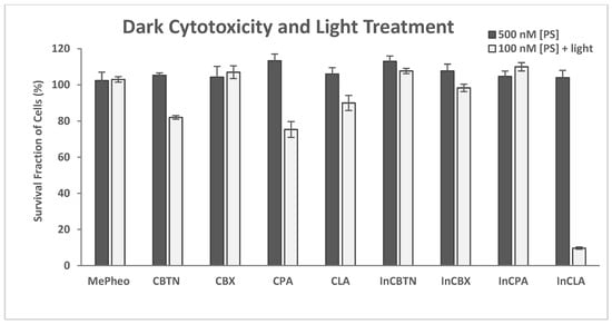 The dark cytotoxicity and light treatment of the PS-treated TNBC cells are shown in Figure 4. The PSs were CBTN, CBX, CPA, CLA, and their In complexes, including the starting precursor MePheo. The PS concentration was 500 nM and 100 nM in the dark and light-treated conditions, respectively. No cytotoxicity was observed in the absence of light, and InCLA (9.6% cell survival) was the most phototoxic, followed by CPA (75.3%) and CBTN (82.0%) at 100 nM. The TNBC cell survival at low concentrations (10–100 nM) of selected PSs (CBTN, CPA, InCLA, and MePheo) is shown in Figure 5, with InCLA exhibiting a significant dose-dependent response compared to the other PSs considered.