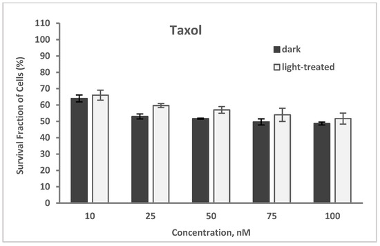 The cytotoxicity of taxol (paclitaxel) at varying concentrations of 10–100 nM in TNBC cells in the dark and upon light exposure is shown in Figure 6. The cell survival decreased from 64% to 49% and from 66% to 52% for the taxol-only treated cells in the dark and upon light irradiation, respectively. A very low increase (average of 4%) in cell survival was observed with the taxol-treated cells upon light irradiation compared to the unirradiated cells.