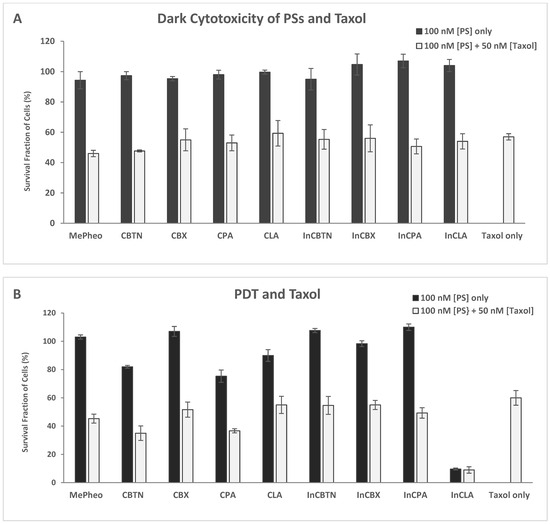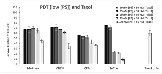 The PS-treated cells (at 100 nM) in the dark showed no cytotoxicity (Figure 7A). Co-treatment of the TNBC cells with PS (100 nM) and taxol (50 nM) for 24 h without light exposure resulted in an average of 53% cell survival (46% lowest for MePheo and 59% highest for CLA) compared to the taxol-only treated cells with 57% survival. In the absence of light, only the cytotoxic effect of taxol was effective.