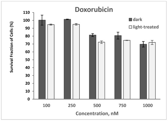 The cytotoxicity of doxorubicin (DOX) at varying concentrations of 100–1000 nM in TNBC cells in the dark and upon light exposure is shown in Figure 9. Cell survival decreased from 100% to 70% and from 95% to 72% for the doxorubicin-only treated cells in the dark and upon light irradiation, respectively. A very low decrease (average of 2–5%) in cell survival was observed with the doxorubicin-treated cells upon light irradiation compared to the unirradiated cells.