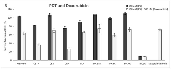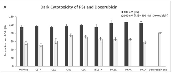 The PS-treated cells (at 100 nM) in the dark showed no cytotoxicity (Figure 10A). These are the same data as shown in Figure 7A, which are included here for comparison. Co-treatment of TNBC cells with PS (100 nM) and doxorubicin (500 nM) for 24 h without light exposure resulted in an average of 63% cell survival (51% lowest for CBTN and 75% highest for CPA) compared to the doxorubicin-only-treated cells with 81% survival. In the absence of light, only the cytotoxic effect of doxorubicin was involved in cell destruction.
