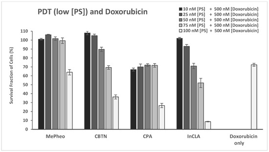 Upon light exposure of the cells co-treated with 500 nM doxorubicin (Figure 10B), InCLA (at 100 nM) was still the most phototoxic, with an observed 9% cell survival, followed by CBTN and CPA, having 35% and 27% cell viability, respectively. InCLA still overwhelmed the effect of doxorubicin at this concentration. Lower concentrations (10–75 nM) of InCLA with 500 nM doxorubicin did not show an additive or synergistic effect upon co-treatment (Figure 11). CBTN and CPA at 100 nM showed a better photodynamic effect when co-treated with doxorubicin than PS-treatment alone. CBTN decreased from 82% to 36% when co-treated with DOX (p = 0.005), while CPA went from 75% to 27% (p = 0.02), with an average cell viability reduction of 47% for both PSs. When compared with DOX-treatment alone, the CBTN–DOX and CPA–DOX treatments decreased the cellular viability from 72% to 36% (p = 0.003) and 72% to 27% (p = 0.007), respectively. Thus, CBTN– or CPA–DOX PDT binary treatment was observed to be better than monotherapy alone, but at a higher concentration than that observed for InCLA-taxol PDT combination.