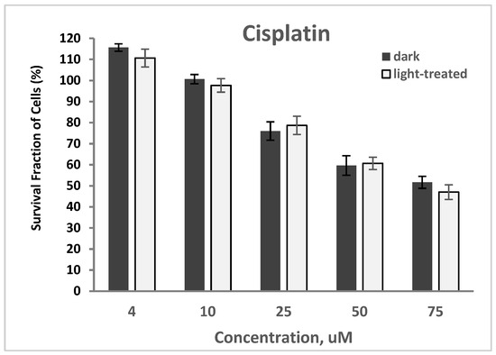 The cytotoxicity of cisplatin at varying concentrations of 4–75 nM in TNBC cells in the dark and upon light exposure is shown in Figure 12. Cell survival decreased from >100% to 52% and from >100% to 47% for the cisplatin-only treated cells in the dark and upon light irradiation, respectively. A very low decrease (average of 3%) in cell survival was observed with the cisplatin-treated cells upon light irradiation compared to the unirradiated cells.