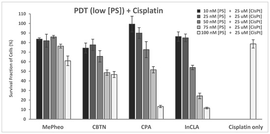 Upon light exposure of the cells co-treated with 25 μM cisplatin (Figure S1B, Supplementary Materials), InCLA (at 100 nM) remained the most phototoxic, with an observed 10% cell survival, followed by CPA and CLA, having 13% and 35% cell viability, respectively. InCLA also overwhelmed the effect of cisplatin at this concentration. CPA and CLA at 100 nM showed a better photodynamic effect when co-treated with cisplatin than PS-treatment alone. CPA decreased from 75% to 13%, while CLA went from 90% to 35%, with an average decline of 59% in cell survival for both PSs. Except for InCLA, the decrease in cell viability of the TNBC cells ranged from 62% to 3% upon co-treatment with 25 μM cisplatin compared to PS-treatment alone at 100 nM. There was an average of a 28% decrease between the binary treatment with PS and cisplatin compared to PS or cisplatin treatment alone (Figure S1B). However, when compared to the cisplatin-treated cell viability, the effect of added cisplatin only caused reduced cell survival in the MePheo-, CBTN-, CPA-, and CLA-co-treated TNBC cells. At 100 nM, CPA-cisplatin treated cells produced a significant decrease in cell viability when compared either with CPA–PDT monotherapy from 79% to 13% (p = 0.008) or cisplatin monotherapy from 75% to 13% (p = 0.005). At lower concentrations of selected PSs (MePheo, CBTN, CPA and InCLA) at 50 nM co-treated with 25 μM cisplatin, a reduced cell survival ranging from 28% to 11% was observed, with an average of 23%, as shown in Figure 13, compared to the PS-treated only cells in Figure 7B. At a lower concentration of 50 nM for InCLA and 25 μM cisplatin, the photodynamic cell destruction increased, as indicated by the amount of cells surviving from 70% for InCLA-only treatment (Figure 5) to 54% in the presence of both InCLA and cisplatin (p = 0.04), with a decrease of 16% indicating a nearly additive effect in TNBC cells (Figure 8). Compared to the cisplatin-only treated cells, the binary treatment of InCLA–PDT–cisplatin decreased cell viability from 79% to 54%, which was a 25% decrease (p = 0.05). Thus, this observation suggests that the InCLA–cisplatin or CPA–cisplatin combination appears to be better than InCLA–PDT or CPA–PDT or cisplatin monotherapy alone.