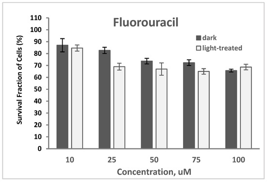 The cytotoxicity of fluorouracil at varying concentrations of 10–100 nM in TNBC cells in the dark and upon light exposure is shown in Figure 14. Cell survival decreased from 87% to 65% and from 85% to 68% for the fluorouracil-only treated cells in the dark and upon light irradiation, respectively. A decrease in cell survival with an average of 9% was observed with the fluorouracil-treated cells upon light irradiation compared to the unirradiated cells.