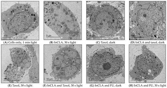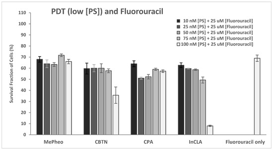 The PS-treated cells (at 100 nM) in the dark showed no cytotoxicity (Figure S2A, Supplementary Materials), which represents the same data as shown in Figure 7A for comparison. Co-treatment of TNBC cells with PS (100 nM) and fluorouracil (25 μM) for 24 h without light exposure resulted in an average of 73% cell survival (61% lowest for MePheo and 84% highest for CLA) compared to the fluorouracil-only-treated cells with 64% survival. In the absence of light, only the cytotoxic effect of fluorouracil was involved in cell destruction (Figure S2A, Supplementary Materials).