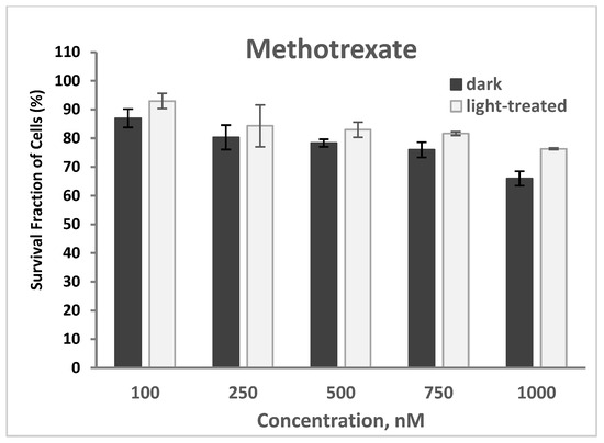 The cytotoxicity of methotrexate at varying concentrations of 100–1000 nM in TNBC cells in the dark and upon light exposure is shown in Figure 16. Cell survival decreased from 87% to 66% and from 93% to 66% for the methotrexate-only treated cells in the dark and upon light irradiation, respectively. An increase (average of 6%) in cell survival was observed with the methotrexate-treated cells upon light irradiation compared to the unirradiated cells.