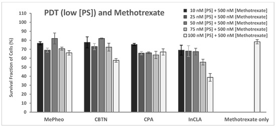 Upon light irradiation of the cells co-treated with 500 nM methotrexate (Figure S3B, Supplementary Materials), InCLA (at 100 nM) still remained the most phototoxic among the PSs tested, with an observed 39% cell survival, followed by CLA or CBTN, CBX, and InCBX, having the same 57–58% cell viability. However, InCLA was observed to cause enhanced cell viability at this concentration. At lower concentrations of selected PSs, only CPA at 50 nM co-treated with methotrexate (500 nM) showed a significant cell viability reduction from 99% (Figure 5) to 66% (Figure 17), with a difference of 33% (p = 0.002), but it was not as significant when compared with the methotrexate-treated cells in which the CPA–PDT–MTX co-treatment only caused a 12% reduction in cell survival (p = 0.06). MePheo and CBTN were observed to cause a difference of only 10% in cell survival compared to PS treatment alone (Figure 17). CPA as a PS in combination with methotrexate appeared to be the best compared to monotherapy alone and with the other PSs used.