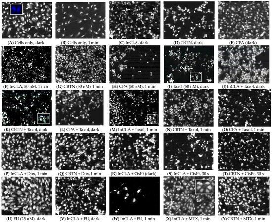 Cell inhibition in TNBC cells is determined based on the cell survival (MTT) assay of the binary therapy blending the effect of PDT and chemotherapeutic agents. In this study, it should be noted that monotherapy alone, either PDT with the photosensitizers (with light) or chemotherapy with chemotherapeutic agents (with or without light), resulted in less treatment efficacy than combination treatment. Table 1 tabulates the percentage inhibition of TNBC cells treated with our eight synthesized PSs (CBTN, CBX, CPA, CLA, and their corresponding indium complexes) and the starting compound MePheo at 100 nM, and simultaneously treated with taxol (50 nM), doxorubicin (500 nM), cisplatin (25 mM), fluorouracil (25 mM), or methotrexate (500 nM). MePheo served as a control compound. The TNBC cells were then exposed to light after binary treatment for 24 h.