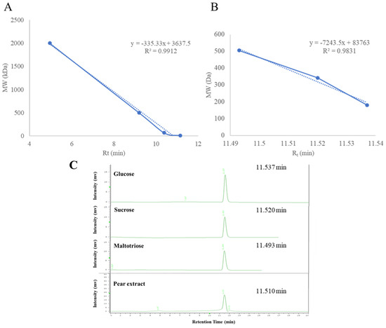 (A) Calibration curves of standards of different molecular weights of 2000, 500, 70, and 10 kDa. (B) Calibration curves of standards of glucose, sucrose, and maltotriose. (C) The retention time of glucose, sucrose, maltotriose, and the active portion of pear water extract in size-exclusion HPLC column.