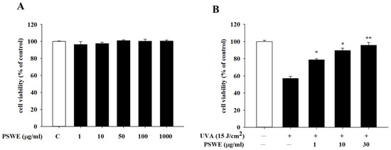 The effects of HaCaT cells treated with different concentrations of PSWE on cell viability (A) and UVA protection (B). Cell viability of HaCaT cells after pretreatment with different concentrations of PSWE (1, 10, 50, 100, and 1000 μg/mL). HaCaT cells were treated with different concentrations of PSWE at 37 °C for 24 h. Values represent the mean ± SEM from at least three experiments. * p < 0.05 and ** p < 0.01 compared with group that was only treated with UVA and not pretreated with extract.