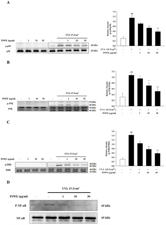 PSWE reduced UVA-induced phosphorylations of p38 (A), JNK (B), ERK (C), and NF-κB (D) in HaCaT cells. HaCaT cells were pretreated with different concentrations of PSWE (1, 10, and 30 μg/mL) for 1 h, and then, the cells were irradiated with UVA (15 J/cm2). Western blots were analyzed quantitatively (right panel). Values represent the mean ± SEM from three independent experiments. ## p < 0.01 compared with the group that was not treated with UVA and extract; * p < 0.05 and ** p < 0.01 compared with group that was only treated with UVA and not pretreated with extract.