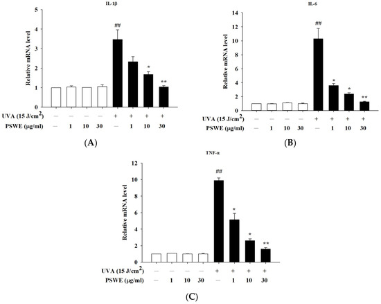 PSWE inhibited UVA-induced mRNA expression levels of IL-1β, IL-6, and TNF-α in HaCaT cells. The effect of PSWE on the mRNA expression levels of cytokines in UVA-stimulated HaCaT cells. HaCaT cells were pretreated with different concentrations of PSWE (1, 10, and 30 μg/mL) for 1 h, and then, the cells were treated with UVA (15 J/cm2) for 24 h. Total RNA was isolated, and the mRNA expression levels of (A) IL-1β, (B) IL-6, and (C) TNF-α were determined using qPCR. Values represent the mean ± SEM from three independent experiments. ## p < 0.01 compared with the group that was not treated with UVA and the extract; * p < 0.05 and ** p < 0.01 compared with group that was only treated with UVA and not pretreated with the extract.