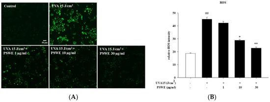 When DCFH-DA enters cells, DCFH-DA is easily hydrolyzed by intracellular esterase to produce DCFH. Due to the presence of reactive oxygen species (ROS), DCFH is converted into the highly fluorescent compound 2′,7′ dichlorofluorescein (DCF). Therefore, as long as the fluorescence intensity is measured, the content of ROS in the cytoplasm can be known [42]. HaCaT cells are cultured at 5 × 104 cells per well for 24 h, and then, the cells are pretreated with different concentrations of PSWE for 1 h. DCFH-DA was added to the cells and incubated at 37 °C for 30 min. Then, cells were washed once with PBS, and then, 1.5 mL of PBS was added. Cells were irradiated by UVA (total energy: 15 J/cm2), and then, the cells were placed in an incubator for 15 min. The fluorescence images were observed under a fluorescence microscope, and the fluorescence intensity in the images was analyzed using Image J 1.54i.