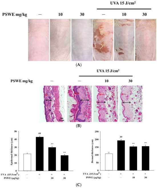 The changes in the skin appearance of the mice were recorded by taking photos. Firstly, the mice were divided into 6 groups, namely, the control group, the PSWE control groups with concentrations of 10 mg/kg and 30 mg/kg, the irradiation by UVA 15 J/cm2 group, and UVA irradiation after pretreatments of 10 or 30 mg/kg PSWE groups. The experimental results showed that feeding different concentrations of PSWE alone did not cause irritation and damage to the mice. The skin appearance was not obvious compared with the control group. However, in the group irradiated with UVA alone, the dorsal skin of the mice began to have peeling and inflammation after the 3rd day. As the number of days of the experiment increased, the phenomenon became more serious. After using PSWE tube feeding, the desquamation and inflammation levels were significantly improved (Figure 7A). H&E staining images of tissue showed that the experimental group irradiated with UVA 15 J/cm2 alone had significantly thickened epidermis and dermis compared with the control group. If treated with different concentrations of PSWE, it can be observed that PSWE can slow down the thickening of the epidermis and dermis, and effectively improve inflammation, redness, and peeling (Figure 7B,C).