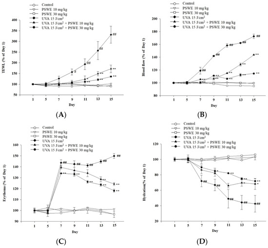 Change in physiological parameters of UVA-induced BALB/cAnN.Cg-Foxn1nu/CrlNarl mouse skin after treatment with PSWE. Analysis of the effect of the change in (A) transepidermal water loss (TEWL), (B) blood flow, (C) erythema, and (D) hydration. Values represent the mean ± SEM from at least three independent experiments. # p < 0.05; ## p < 0.01 compared with the group that was not treated with UVA and the extract; * p < 0.05 and ** p < 0.01 compared with group that was only treated with UVA and not pretreated with the extract.