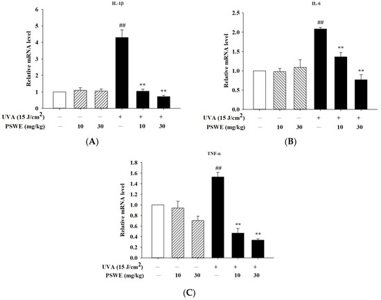 PSWE inhibited UVA-induced cytokine of mRNA expression of IL-1β, IL-6, and TNF-α in the skin tissue of BALB/cAnN.Cg-Foxn1nu/CrlNarl mice. The effect of PSWE on the mRNA expression levels of cytokines in UVA-stimulated mice. Mice were pretreated with different concentrations of PSWE (10 and 30 mg/kg) for 15 days, and then, the mice were irradiated with UVA (15 J/cm2) five times. Total RNA was isolated, and the mRNA expression levels of (A) IL-1β, (B) IL-6, and (C) TNF-α were determined using qPCR. Values represent the mean ± SEM from three independent experiments. ## p < 0.01 compared with the group that was not treated with UVA and the extract; ** p < 0.01 compared with group that was only treated UVA and not pretreated with the extract.
