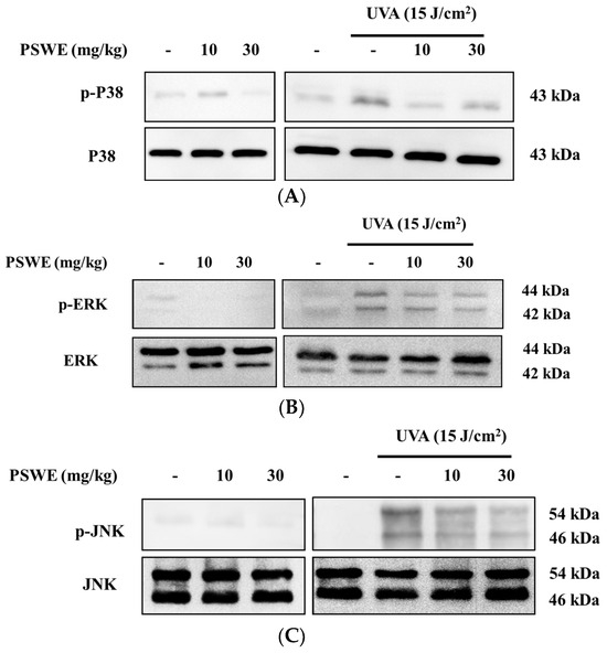 Previous studies have shown that, in the immune and inflammatory responses, the MAP kinase signal transduction pathway is activated [17]. Therefore, we wanted to understand the effect of PSWE on the activation of the MAP kinase pathway in mice after UVA irradiation. Because in vitro studies have confirmed that PSWE can effectively regulate the phosphorylation of the three main proteins, we want to confirm this result through in vivo experiments. The results show that the phosphorylation of p38, ERK, and JNK proteins is unaffected in mice treated with different concentrations of PSWE. In contrast, the group irradiated with UVA alone exhibited an increased phosphorylation of MAP kinases. In the groups treated with different concentrations of PSWE, it can be observed that the protein phosphorylation of p38, ERK, and JNK decreases as the concentration of PSWE increases (Figure 10).