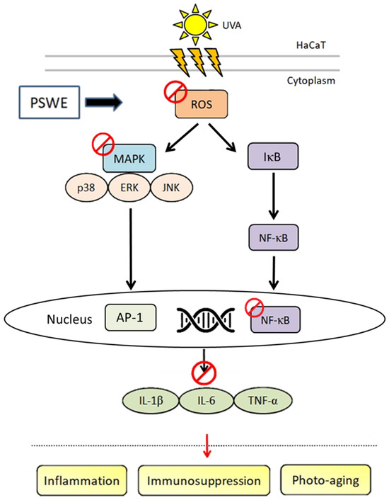Mechanisms by which PSWE attenuates UVA-induced photoaging in HaCaT cells. UVA causes ROS production, activates MAP kinase, further causes NF-κB to translocate to the nucleus, and produces a variety of cytokines including IL-1β, IL-6, and TNF-α. The production of cytokines can lead to skin inflammation, immune effects, and even photoaging. Results show that PSWE inhibits the production of ROS, MAP kinase, and the aforementioned cytokines, which can prove that PSWE has anti-photoaging effects.