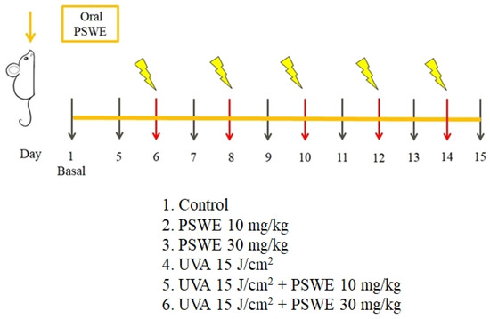 Study design of in vivo experimental model. The mice were divided into six groups, namely, 1. control group, 2. PSWE (10 mg/kg), 3. PSWE (30 mg/kg), 4. UVA 15 J/cm2 experimental group, 5. PSWE (10 mg/kg) + UVA 15 J/cm2 group, and 6. PSWE (30 mg/kg) + UVA 15 J/cm2 group. After the oral administration of PSWE at two different concentrations (10 mg/kg or 30 mg/kg), the skin physiological values of each mouse were measured on the 5th day, and then again on the 6th, 8th, 10th, 12th, and 14th days. Each mouse was irradiated with UVA 15 J/cm2 every day. PSWE was administered continuously for 15 days. The physiological values were measured on the second day of UVA irradiation, and the skin physiological conditions of the mice were recorded.