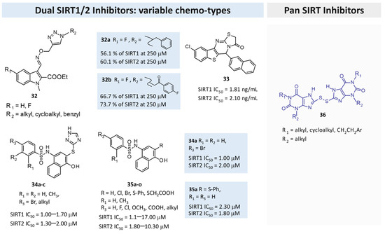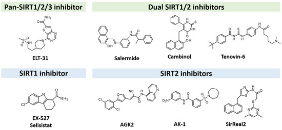 Chemical structure of the most-studied SIRTIs. Dual/pan SIRTIs are labeled in green while the selective ones are reported in cyan.