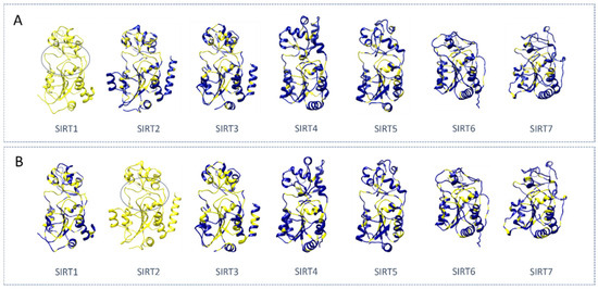 Conservation of the residues among the seven SIRTs with respect to SIRT1 (A) and SIRT2 (B). The non-conserved residues are colored in blue and the conserved residues are colored in yellow. High-sequence conservation was observed in the catalytic site (circled) of SIRTs1-3. Structure IDs: SIRT1:4IG9 [27], SIRT2: 3ZGO [28], SIRT3: 3GLS [29], SIRT4: AF-Q9Y6E7-F1 via AlphaFold [30,31], SIRT5: 4HDA [32], SIRT6: 5X16 [33], and SIRT7: AF-Q9NRC8-F1 via AlphaFold [30,31]. Note that, for SIRT4 and SIRT7, the predicted fold was used for the shown comparison in the absence of an experimental structure.