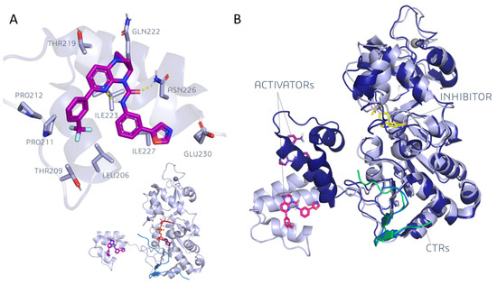 (A) The binding mode of a dihydropyridopyrazine derivative, a SIRT1 activator (PDB ID: 4ZZJ) [37]. The activator is bound at SIRT1 N-terminal domain. The catalytic domain was solved in a complex with a cofactor (NAD+, red sticks) and a substrate of the protein. The CTR fragment (light blue) is also reported. (B) The superimposition of the SIRT1 structure in complex with a diazepine derivative activator alone (magenta, light blue ribbon, and PBD ID: 4ZZH [37]) and the SIRT1 structure in complex with a dihydropyrido-pyrazine activator (purple) and a thienopyrimidine inhibitor (yellow, dark blue ribbon, and PBD ID: 4ZZI [37]). The CTR fragment is represented in green and in light blue for 4ZZH and 4ZZI, respectively.