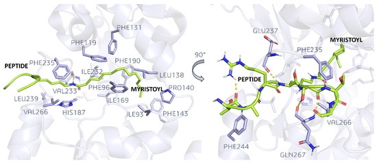 Myristoyl is inserted in a hydrophobic cavity located between the Rossman fold and the Zinc binding domain, which is formed by the VAL226, LEU239, HIS187, PHE235, PHE119, ILE232, ILE169, PHE96, PHE131, PHE190, LEU138, PRO140, PHE143, and ILE93 residues. The amide bond derived from the lysine myristoylation establishes an H-bond with the VAL233 backbone. The protein fragment to which myristoyl is tied to interacts with the entrance of the binding site by means of H-bonds with GLU237 (backbone) and GLN267 (backbone). Moreover, PHE235, PHE244, and VAL266 further stabilize the peptide.