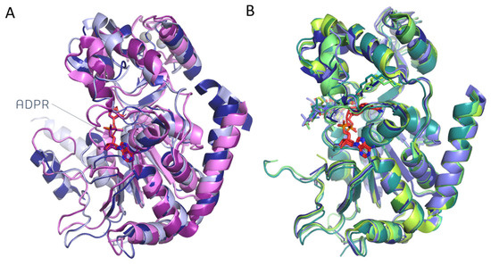 (A) Superimposition of the SIRT2 apo-structures lacking substrates/reaction products (1J8F [47]: dark blue, 3ZGO [28]: light blue, 3ZGV [28]: dark violet, ADPR in red sticks, and 5D7O [26]: light violet). ADPR is represented as sticks. (B) The superimposition of the substrate-bound structures of SIRT2 available on the Protein Data Bank (4Y6L [51]: forest, 4Y6O [51]: yellow-green, 5FYQ [46]: light-blue, 5G4C [49]: blue, 6L66 [50]: cold light green, and 6L65 [52]: teal). The cofactor, where present, is represented as red sticks.