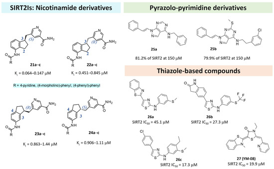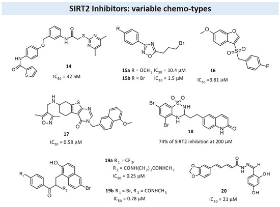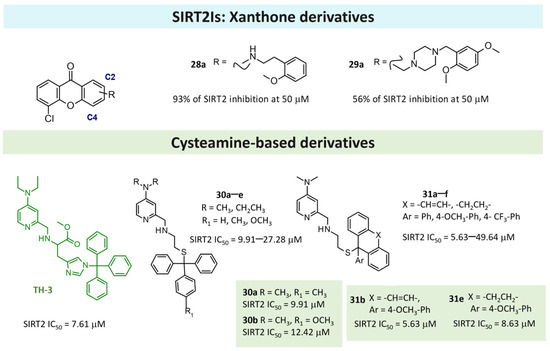 Regarding the non-reaction mechanism related to SIRT2Is, most of the reported X-crystallographic data contain an SIRT2 isoform-selective ligand. Indeed, most of the chemical diversity thus far explored is limited to the SirReal2 series, as previously reported by us [66] and confirmed by the abundance of X-ray SIRT2 structures complexes containing SirReal2 or its derivatives (see Table 3).