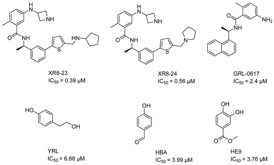 Prominent allosteric inhibitors of the Y268 site include XR8-23 (IC50 = 0.39 μM), XR8-24 (IC50 = 0.56 μM) [46], and GRL-0617 (IC50 = 2.4 μM) [47] (Figure 1). On the other hand, the inhibitors reported for the allosteric site that is centered on amino acid H73 prevent PLpro from binding to ISG15. Specifically, the Ser22, Met23 and Glu27 amino acids of ISG15 lose the ability to interact with PLpro [44]. Amino acid mutations in this allosteric region, such as F69A and V66A, reduce the enzymatic activity of PLpro. In addition, the enzyme kinetics slow down compared to its wild-type state [30]. The inhibitors reported to date for the H73 site are YRL (IC50 = 6.68 μM), HBA (IC50 = 3.99 μM), and HE9 (IC50 = 3.76 μM) (Figure 1) [44].